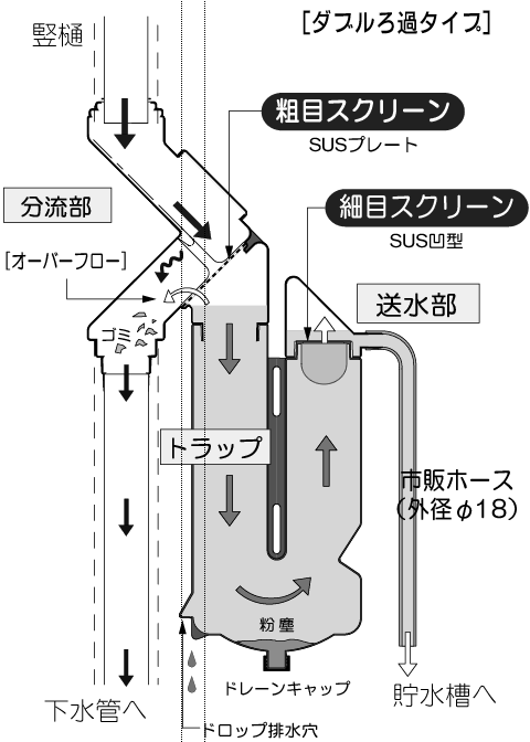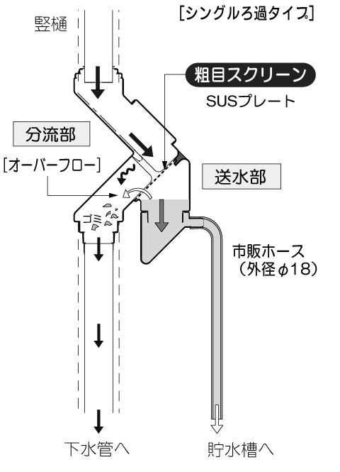 - 竪樋に取付けた「分流部」により、雨水に混入したゴミを粗目スクリーンによって除去しながら雨水を集めます。
