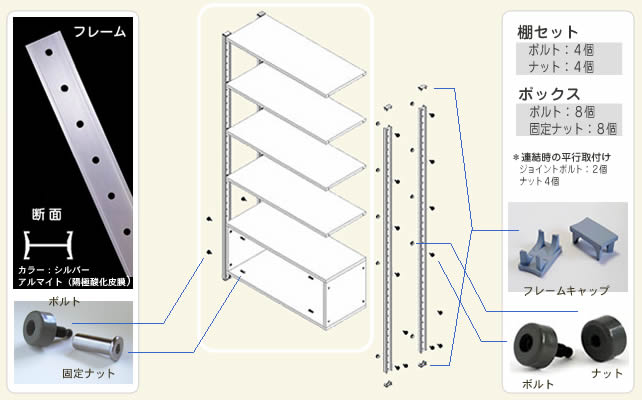 - 連結時、棚は平行(ジョイントボルトを使用)にも段違いにも取付けが出来ます。>追加スパンには、予備のボルト&ナットがセットされています。