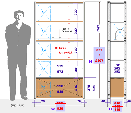 - 棚は、高さを50ミリピッチで組立後も変更出来ます。